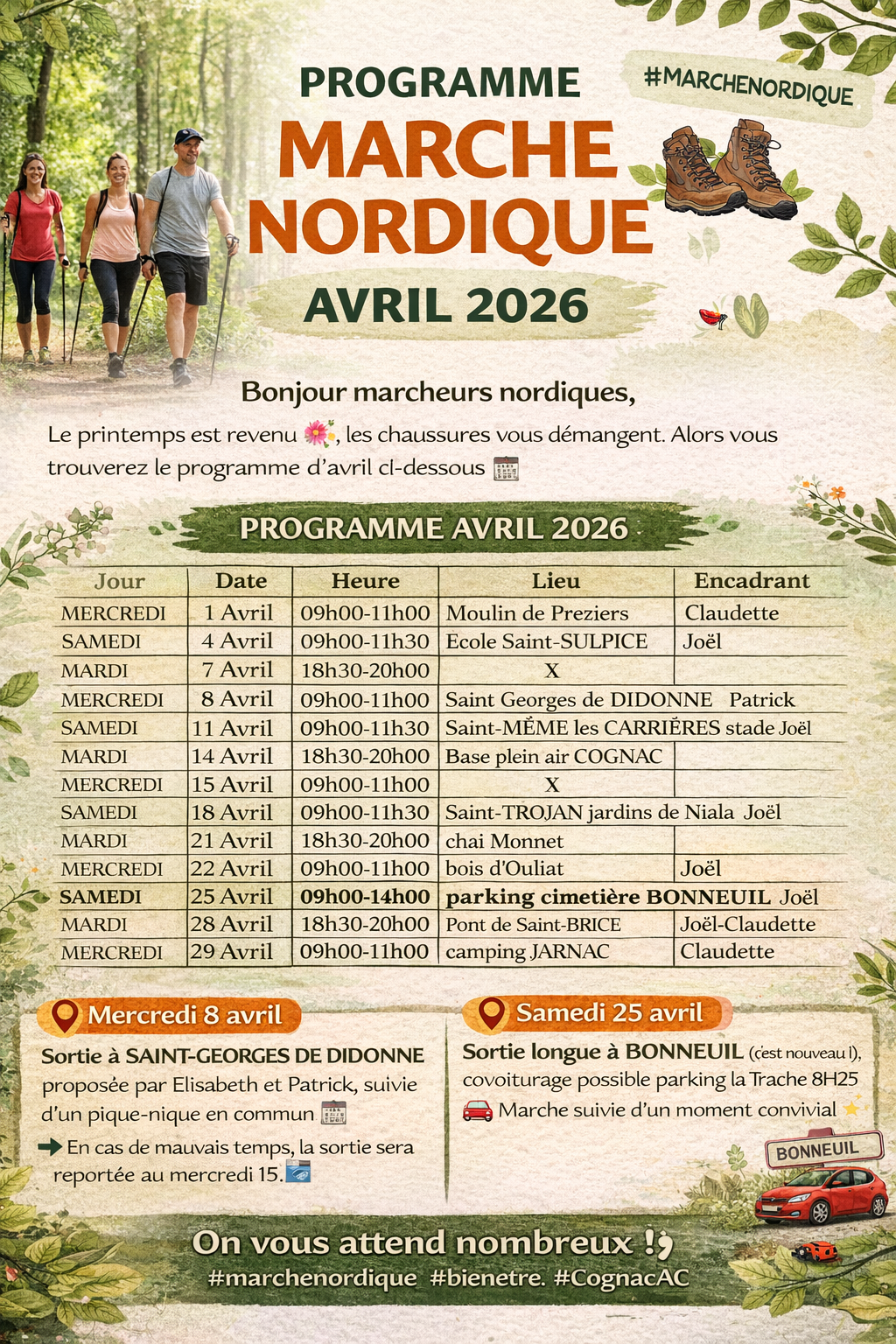 Le printemps est de retour 🌸 et les chaussures vous démangent ? Parfait ! Voici le programme d’avril pour partager ensemble de beaux moments sportifs et conviviaux 💚